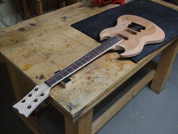 その後、メープル材と接着剤を使いフレット溝を埋めていきます。