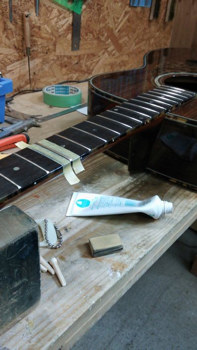 アコギはネック、サドル弦高調整後にフレットを磨いて仕上げました。